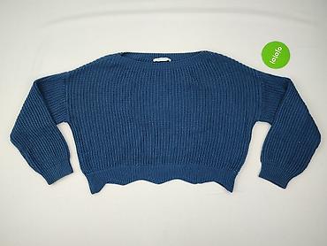 Granatowy sweter damski marki Promod, wykonany z dzianiny o wyraźnej, teksturowanej fakturze. Posiada okrągły dekolt wykończony srebrną lamówką oraz rozcięcie z zapięciem na guzik z tyłu. Rękawy o ...