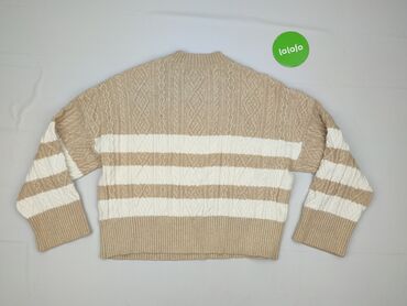 Sweter damski w paski, rozmiar S - Fason: z dekoltem w serek (V-neck), długi rękaw, ściągacze przy mankietach i u dołu - Wzór: szerokie poziome pasy w kolorach białym i jasnoszarym; ażurowe, drobn...