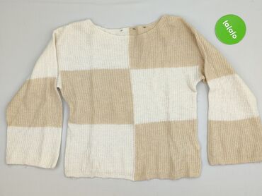 Sweter damski w beżowym kolorze, wykonany z dzianiny o wyraźnej, poziomej fakturze. Posiada dekolt w kształcie litery V, co nadaje mu klasyczny wygląd. Długie rękawy i luźny krój zapewniają komfort...Stan: