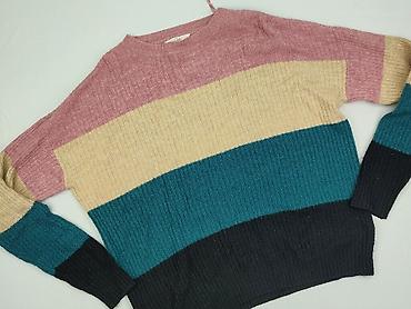 Damski sweter w paski z kieszenią - Rozmiar: S (z metki) - Skład: 100% akryl - Krój: klasyczny, okrągły dekolt - Wzór i kolory: biało-czarna baza w wąskie poziome paski; rękawy asymetryczne – jede...