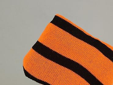 - Wzór: poziome pasy – intensywny pomarańcz z czarnymi prążkami; szerokie kremowe pasy na mankietach i u dołu