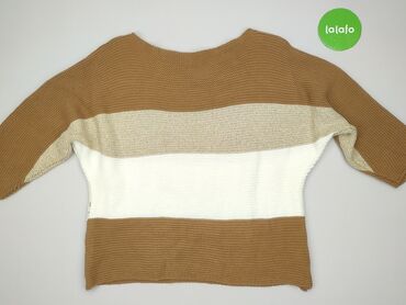 Damski sweter w paski, rozmiar M - Krój: klasyczny, z okrągłym dekoltem i długim rękawem - Wzór: poziome pasy w odcieniach jasnoniebieskiego, brązu, czerni i szarości na kremowym tle - Materiał: 1...