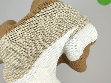 Sweter damski w kolorowe pasy - Krój: oversize, szerokie rękawy 3/4, obniżona linia ramion - Dzianina: grubszy, miękki splot - Wzór: poziome pasy w kolorach pomarańczowym, żółtym, ecru/białym i pu...