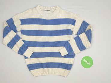 Damski sweter w paski, rozmiar S - Fason: klasyczny sweter z długim rękawem i okrągłym dekoltem - Wzór: białe tło w poziome czarne pasy (marynarski styl) - Detale: kontrastowe, kobaltowe wykończen...