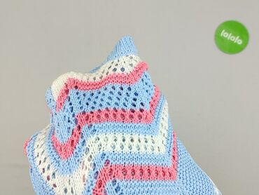 Sweter dziecięcy z włochatej przędzy, z długim rękawem i okrągłym dekoltem. - Kolorystyka: melanż błękitów, bieli, kremu i żółci, tworzący lekko geometryczny wzór. - Faktura: miękka, puchata/pr...