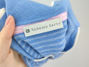 - Wzór: poziome paski w odcieniach błękitu, granatu, bieli i żółci; kontrastowa lamówka przy dekolcie