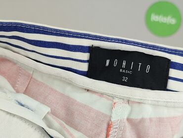 Szorty damskie Mohito Collection - Rozmiar: 36 (z metki) - Wzór: paski biało-granatowe, pionowe - Krój: krótkie, z mankietem na dole nogawki - Zapięcie: suwak + guzik - Pas: szlufki, ozdobne patki...