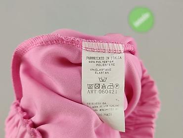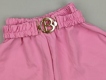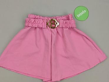 Różowe szorty damskie z rozkloszowanymi nogawkami i elastycznym, marszczonym pasem. W komplecie ozdobny pasek w kolorze złota z dużą, okrągłą klamrą z literą „B”. Materiał gładki, lekko elastyczny: 94% poliester, 6% elastan (informacja z metki, Made in Italy). W pasie szeroka guma zapewniająca dopasowanie i wygodę. Krój przypominający spódniczkę – bardzo zwiewny i kobiecy. Idealne na lato, do stylizacji casual i bardziej eleganckich.