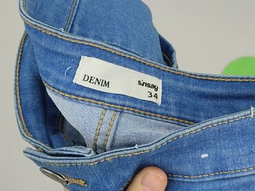 Szorty jeansowe Sinsay - Model: krótkie spodenki z denimu - Rozmiar z metki: 34 - Krój: luźny, z lekko zaokrąglonymi bokami - Talia: wysoka, elastyczna gumka z widocznym, dekoracyjnym przeszyciem ...