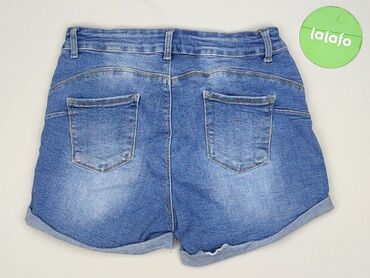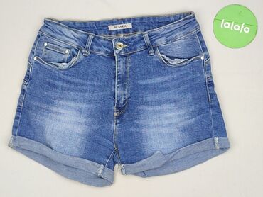 Spodenki jeansowe damskie marki M'SARA z wysokim stanem. Charakteryzują się jasnym, niebieskim odcieniem denimu i detalami w postaci czarnego elastycznego paska z napisem "MONEY STUDIO". Spodenki p...