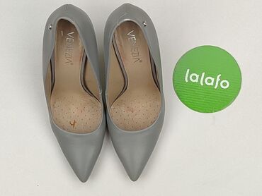 Czółenka damskie na słupku, rozmiar 36 - Kolor: jasnoszary - Materiał cholewki: lakierowana skóra/eko-skóra z połyskiem - Noski: migdałowe, z lakierowanym panelem na przodzie - Zapięcie: pasek z k...