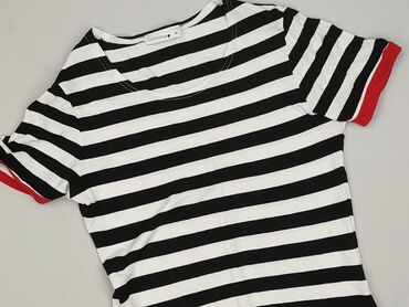 T-shirt damski w paski - Kolor: biało-czarne poziome pasy - Krój: klasyczny, lekko dopasowany - Rękaw: krótki - Dekolt: okrągły, obszyty czarną lamówką - Rozmiar z metki: S - Materiał: miękka dzia...