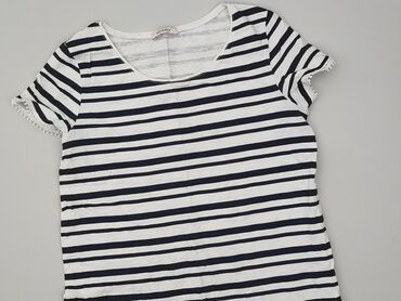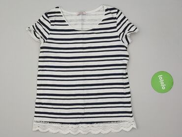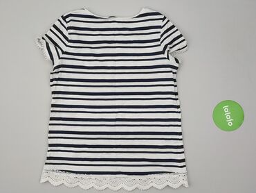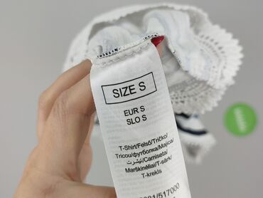 T-shirt damski w paski - Kolor: biało-czarne poziome pasy - Krój: klasyczny, lekko dopasowany - Rękaw: krótki - Dekolt: okrągły, obszyty czarną lamówką - Rozmiar z metki: S - Materiał: miękka dzia...