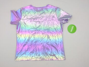 Biała koszulka z krótkim rękawem z kolorowym, błyszczącym nadrukiem „OT” w czterech panelach (żółty, zielony, różowy, niebieski). Front zdobiony dużą ilością aplikacji: cyrkonie/kryształki i drobne...Stan: