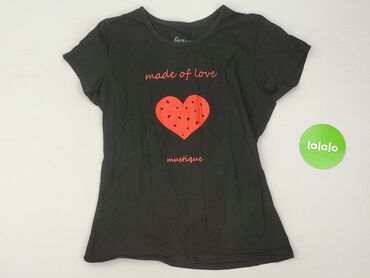 Damska koszulka z krótkim rękawem, czarna, rozmiar M. - Fason: dopasowany, okrągły dekolt. - Nadruk: małe serduszko i napis w kółku przy lewej piersi („all you need is love and peace” – widoczne na...