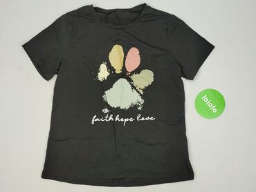 OkrągłyT-shirt damski SHEIN, rozmiar EU L (US 8/10). Kolor: czarny. Krój: klasyczny, z krótkim rękawem i okrągłym dekoltem. Na przodzie nadruk śladu łapy w pastelowych kolorach oraz napis „faith hope love”.