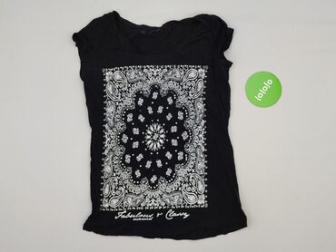 Czarna koszulka damska Reserved, rozmiar M. - Krój: luźny T‑shirt z krótkim rękawem typu kimono i okrągłym dekoltem - Przód: duży kwadratowy nadruk w stylu mandali z białych kropek - Tył: gładki, ...
