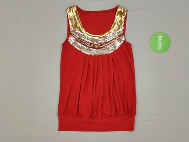Bez rękawówTen czerwony top damski to elegancki wybór z ozdobnym dekoltem, który przyciąga wzrok. Dekolt jest ozdobiony rzędami błyszczących cekinów w odcieniach złota i brązu, co dodaje blasku i wyróżnia top. Marszczenia materiału pod dekoltem zapewniają swobodne i wygodne dopasowanie, a także dodają ubraniu lekkości. Dół topu jest zakończony szerokim ściągaczem, co pozwala na różnorodne stylizacje i zapewnia, że top dobrze układa się na sylwetce. Idealny na specjalne okazje, wieczorne wyjścia lub jako element casualowej stylizacji z odrobiną elegancji. Można go łączyć z wąskimi spodniami, spódnicami lub szortami, tworząc zarówno eleganckie, jak i luźniejsze zestawy. Jest to uniwersalna propozycja dla kobiet ceniących sobie połączenie komfortu i efektownego designu.