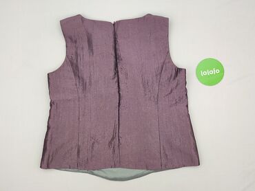 Fioletowa bluzka bez rękawów z falbanami - Krój: lekko dopasowany, długa linia, bez rękawów - Dekolt: w kształcie litery V z obfitymi falbanami przechodzącymi asymetrycznie przez przód - Dół: falb...