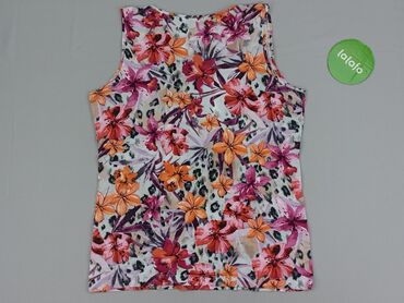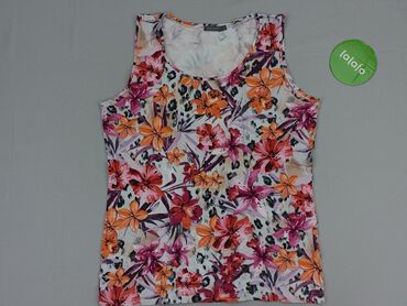 Top damski bez rękawów w kwiaty - Krój: klasyczny, okrągły dekolt, dopasowana sylwetka - Wzór: gęsty nadruk kwiatowy na granatowym tle; kolory kwiatów: beż, róż, brzoskwinia, niebieski, ecru - Mat...Top damski bez rękawów Marinello, rozmiar L.