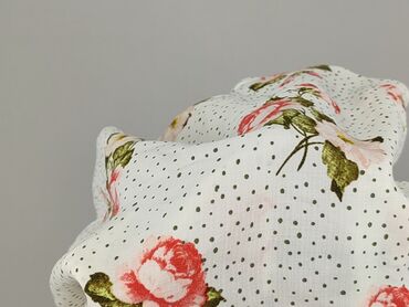 - Wzór: białe tło w drobne oliwkowe groszki z kwiatowym printem (róże/peonie w odcieniach różu i zieleni)