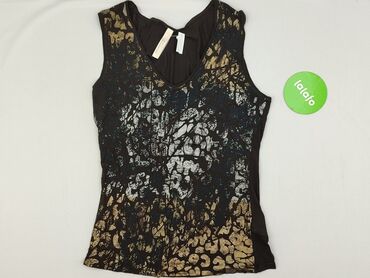 Bluzka bez rękawów OUTFIT FASHION, rozmiar 42. - Przód z satynowym panelem w czarno‑białym, malarskim wzorze. - Tył gładki, czarny z lekkiej dzianiny; zapięcie na mały guziczek i łezkowe wycięcie....