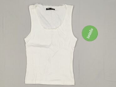 Biała koszulka bez rękawów Sinsay - Rozmiar: S (na metce) - Krój: krótki top typu tank, okrągły dekolt, szerokie ramiączka - Kolor: biały - Skład materiału (z metki): 95% bawełna, 5% elastan – prz...
