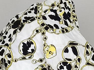 - Wzór: biało‑czarny nadruk w cętki z motywem złotych łańcuchów, kłódek i kluczy