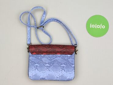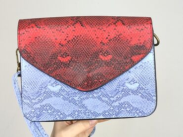 - Kolorystyka: front i klapa w tonacji czerwonej, korpus i pasek w jasnym błękicie, całość w połyskującym, wężowym princie.