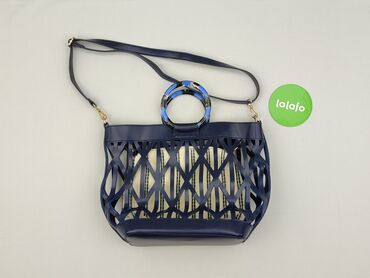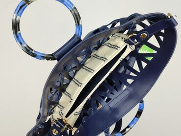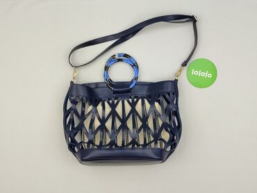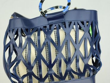TorebkaTorebka damska typu koszyk/handbag, granatowa z ażurową, wycinaną konstrukcją z ekoskóry. W środku znajduje się wyjmowany materiałowy worek w kolorze ecru w czarne paski, zamykany na suwak.