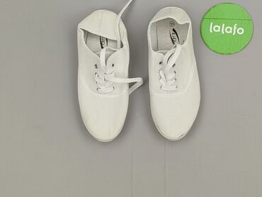 Białe trampki damskie, wysokie (za kostkę) - Klasyczny fason z okrągłym, gumowym noskiem - Cholewka z płóciennej tkaniny w kolorze białym - Sznurowane na białe, płaskie sznurówki; metalowe oczka -...