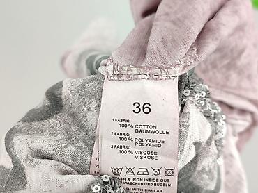 Bluzka damska Tredy, rozmiar 36 - Krój: dopasowany, lekko wydłużony dół, długi rękaw - Dekolt: okrągły - Kolorystyka: szarości, grafit, biel; nadruk w stylu artystycznym/abstrakcyjnym z subtelnymi...Stan: