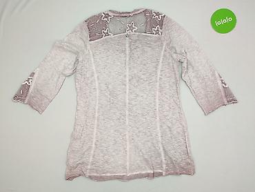 Bluzka damska Tredy, rozmiar 40. - Kolor: odcienie szarości/niebieskiego, cieniowany. - Fason: luźny, asymetryczny dół, rękaw 3/4. - Dekolt: okrągły. - Detale: - Duża koronkowa aplikacja w kszta...