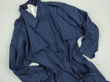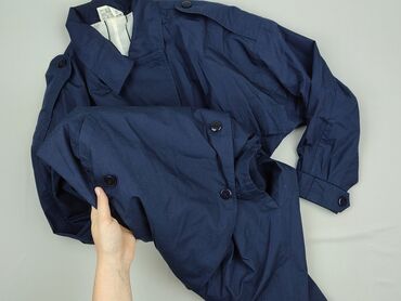 Krótki trencz damski marki H&M DIVIDED w kolorze niebieskim. Ten dwurzędowy płaszcz ma duże, czarne guziki i kołnierz z klapami, dodając mu klasycznego wyglądu. Dwie kieszenie z przodu są praktyczn...