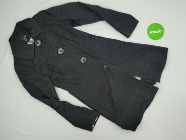 Płaszcz damski H&M - Kolor: czarny - Fason: trencz z kołnierzem z klapami, dwurzędowe zapięcie na guziki - Pasek w talii z klamrą + szlufki, dodatkowe patki/przeszycia podkreślające linię talii - ...