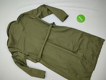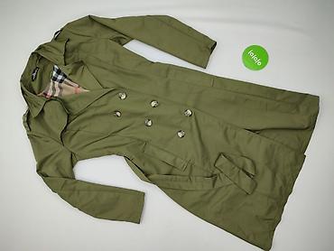 Damski płaszcz/trencz w kolorze ciemnej oliwki, z lekkiego, nieprzemakającego w dotyku materiału, na podszewce. Krój przed kolano, dwurzędowe zapięcie na duże guziki, klasyczny kołnierz i pagony/kl...