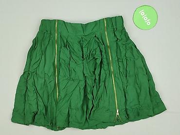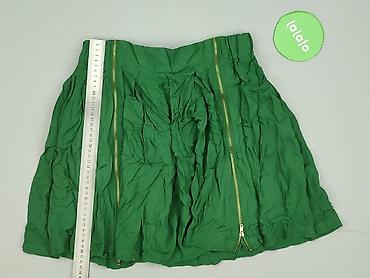 Zielona spódnica damska Troll, rozmiar S - Krój: mini, delikatnie bombkowy z zakładkami z przodu i z tyłu - Stan: używana - Talia: wysoka, szeroki pas z podwójnymi szlufkami na pasek - Zapięcie: z...Długość: