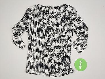 Bluzka damska Blue, rozmiar 38. - Fason: luźny, z delikatnym marszczeniem/przeszyciem przy dolnym brzegu tworzącym lekko „bombkowy” dół. - Rękaw: długi. - Dekolt: łódka. - Wzór: geometryczno-kwiat...