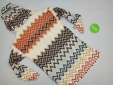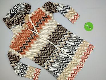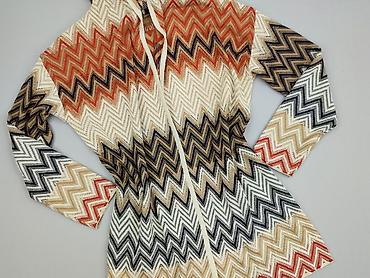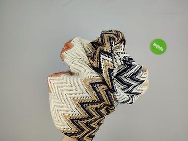 Damski kardigan z kapturem, rozmiar M. - Fason: miękki, otwarty kardigan z szerokim kołnierzem układającym się w szal; długość za biodra. - Wzór/kolor: pasy i geometryczne motywy w odcieniach biel...