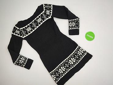 Damski sweter/tunika z dzianiny, czarny z geometrycznym wzorem. - Krój: wydłużona tunika, dopasowana w talii, za biodra - Dekolt: okrągły - Rękaw: długi - Dzianina: średniej grubości, elastyczna -...