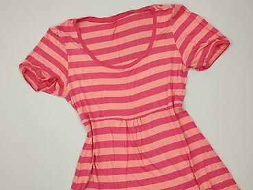 Sukienka damska w paski, krótki rękaw - Fason: koszulowa, przed kolano, dół lekko zaokrąglony - Wzór: poziome paski w kolorach czerwonym, granatowym i białym - Dekolt: w serek z listwą i trzema oz...
