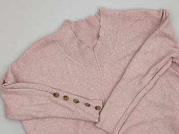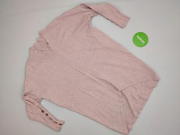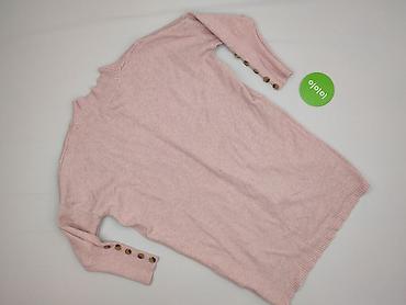 Różowy sweter/tunika damska z dzianiny o wyraźnym, grubym splocie. - Fason: dłuższy krój typu tunika, rozcięcia po bokach u dołu, rękaw długi. - Dekolt: w kształcie litery V. - Kolor: pudrowy ró...