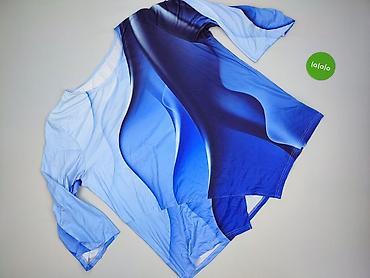 Damska bluzka/tunika z krótkim rękawem, rozmiar XXL. - Fason: lekko luźny, z otwartą wstawką z przodu imitującą rozpięcie; dekoracyjne trzy guziki na środku. - Kolorystyka: granatowa baza, rękawy ...