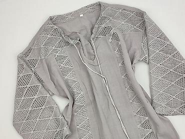 Zwiewna tunika/bluzka damska w kolorze jasnoszarym. - Fason: luźny, oversize, długość tuniki do bioder/uda, lekko prześwitująca warstwa wierzchnia - Dekolt: szeroki, marszczony, ozdobiony dużymi, ...
