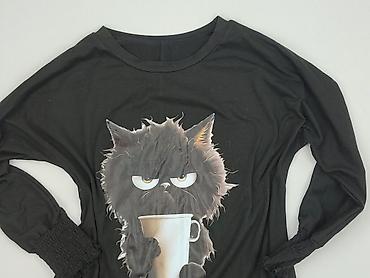 Czarna damska tunika/bluzka z długim rękawem i nadrukiem kota z kubkiem kawy.
