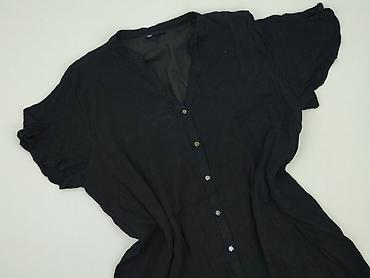 Czarna damska koszula/tunika z krótkim rękawem, zapinana z przodu na rząd napów. Lekka, przewiewna tkanina o subtelnej, karbowanej/kreponowej fakturze. Dekolt w kształcie litery V bez kołnierzyka, lekko opadające rękawy dodające swobodnego charakteru. Dłuższy, luźniejszy krój – świetna jako tunika do legginsów lub jako lekka narzutka na top.