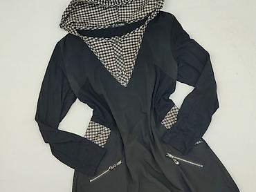 Czarna dzianinowa tunika/sukienka damska - Fason: dopasowany w talii, rozszerzany ku dołowi; krótkie, opadające rękawki - Dekolt: szeroki, łódkowy - Wzór splotu: geometryczny, ażurowy (pionowe prą...