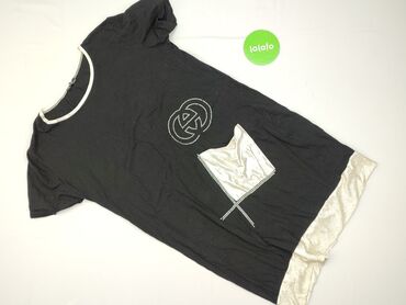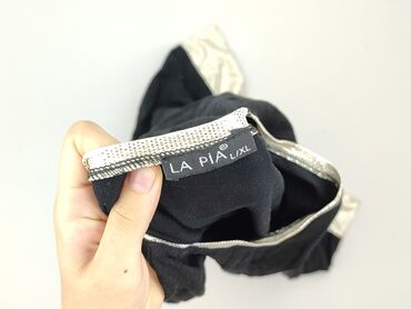 Krótki rękawCzarna tunika damska marki La Pia w rozmiarze L/XL. Tunika ma krótki rękaw i okrągły dekolt, ozdobiony białym obszyciem. Z przodu znajduje się srebrny nadruk imitujący logo. Na dole tuniki, z przodu i z tyłu, doszyto szeroki, błyszczący materiał w kolorze białym, który nadaje tunice unikalny wygląd. Całość tworzy stylowy i wygodny element garderoby. Idealna do noszenia na co dzień, zarówno do spodni, jak i legginsów.