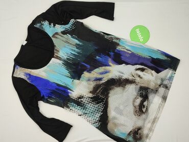 Bluzka damska Lady M z nadrukiem - Fason: luźna tunika/bluzka z krótkim rękawem, okrągły dekolt. - Kolor: czarny tył; przód z dużym, artystycznym nadrukiem – czarno‑biały portret kobiety oraz inte...