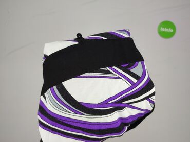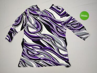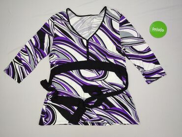 Rękaw 3/4Tunika damska w rozmiarze S, o długości do bioder, z długimi rękawami zakończonymi mankietami. Dekolt w kształcie litery V, z przodu na wysokości biustu zapinana na guziki, co pozwala na regulację głębokości. Tunika posiada wiązanie w pasie, które podkreśla sylwetkę i dodaje stylizacji lekkości. Całość zdobi wzór w paski w odcieniach fioletu, bieli, czerni i szarości. Tunika jest wykonana z materiału, który dobrze dopasowuje się do ciała. Idealna do noszenia na co dzień, zarówno do spodni, jak i legginsów.